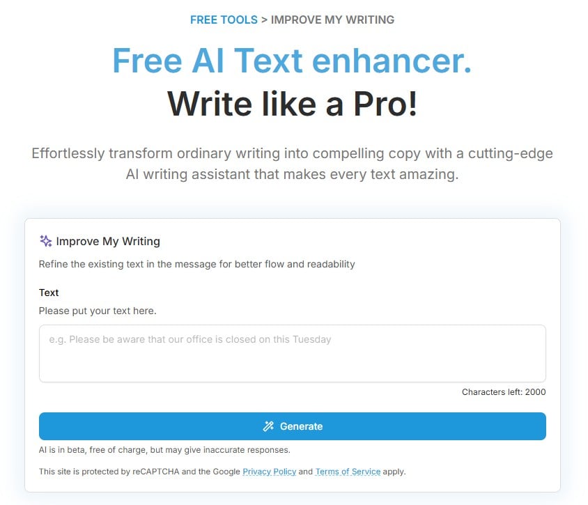 If you need speed, start with Help Me Write to generate a first draft. Then use the Text Enhancer to improve tone and clarity, and the Proofreader to finalize grammar and spelling.