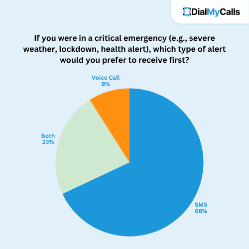 The data shows a clear pattern. No single channel guarantees full coverage. 68% prefer an emergency SMS first, 23% want both SMS and a call during major incidents such as severe weather, lockdowns, or public health emergencies, and 9% prefer a call alone. Only 9% preferred a call alone.