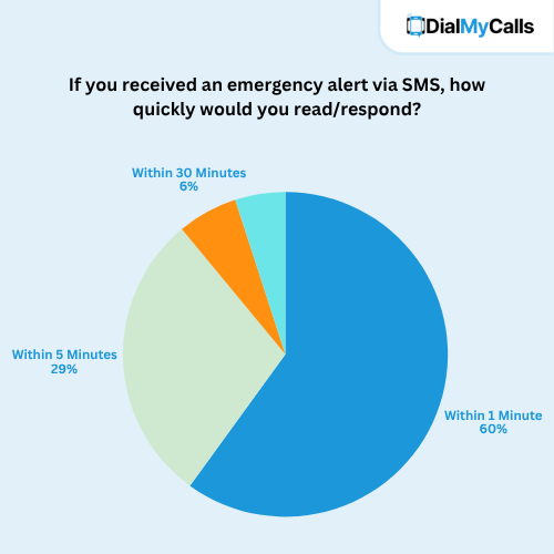 Speed determines how quickly people see and act on an alert. According to the survey, 60% of respondents said they would read or respond to an emergency SMS within one minute, and another 29% would do so within five minutes. That means nearly nine out of ten adults check their texts within minutes of receiving them.