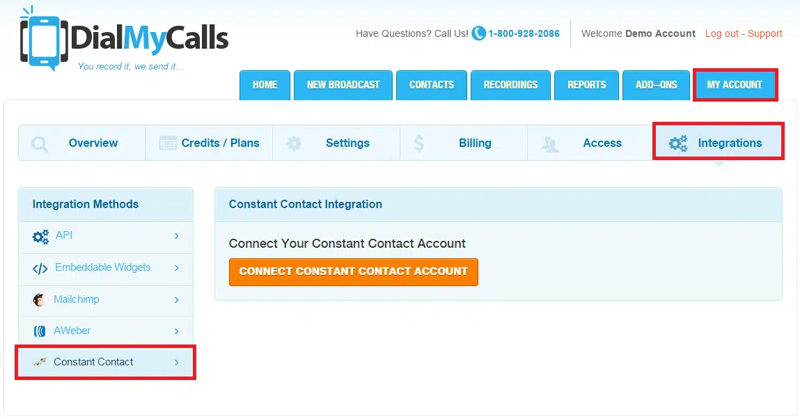 You will need an account with DialMyCalls as well as Constant Contact to utilize our new integration. The first thing you are going to want to do is log into your DialMyCalls account and navigate to “My Account” -> “Integrations” -> “Constant Contact”.