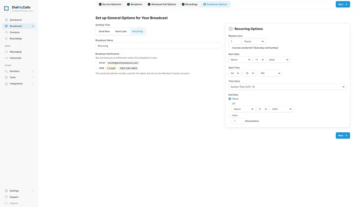 Setting up a recurring message is quite simple as we have added it to the existing DialMyCalls “New Broadcast” process. Once you have selected the type of message(s) you’d like to send, you will come to the “Broadcast Options” step. On this step is where you will choose when you send your message(s) out – you can choose “Send Now”, “Send Later”, or “Recurring”. Select the “Recurring” option to open up the recurring messaging options. A recurring message can be set up to go out daily, weekly, monthly, or yearly with the option to cancel on a specific date or after a certain number of occurrences.